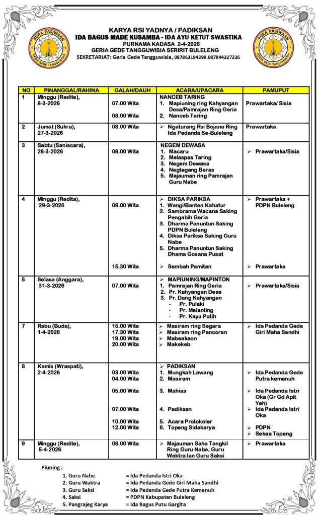 Atas Asung Kertha Wara Nugraha Ida Sang Hyang Widhi Wasa/ Tuhan Yang Maha Esa, kami bermaksud mengundang Bapak/ Ibu/ Saudara/ i pada Upacara Dewa Yadnya Karya Rsi Yadnya / Padiksan Ida Bagus Made Kusamba - Ida Ayu Ketut Swastika kami.